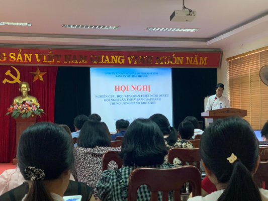 Hội nghị đã được nghe đồng chí Trần Văn Thuần - Phó bí thư thường trực Đảng ủy khối Cơ quan và Doanh nghiệp tỉnh Ninh Bình truyền đạt nội dung cốt lõi của Nghị quyết TW 5, khóa XIII. Cụ thể: Nghị quyết số 18-NQ/TW, ngày 16/6/2022, Hội nghị lần thứ năm Ban Chấp hành Trung ương Đảng khoá XIII về tiếp tục đổi mới, hoàn thiện thể chế, chính sách, nâng cao hiệu lực, hiệu quả quản lý và sử dụng đất, tạo động lực đưa nước ta trở thành nước phát triển có thu nhập cao; Nghị quyết số 19-NQ/TW, ngày 16/6/2022, Hội nghị lần thứ năm Ban Chấp hành Trung ương Đảng khoá XIII về nông nghiệp, nông dân, nông thôn đến năm 2030, tầm nhìn đến năm 2045; Nghị quyết số 20-NQ/TW, ngày 16/6/2022, Hội nghị lần thứ năm Ban Chấp hành Trung ương Đảng khoá XIII về tiếp tục đổi mới, phát triển và nâng cao hiệu quả kinh tế tập thể trong giai đoạn mới; Nghị quyết số 21-NQ/TW, ngày 16/6/2022, Hội nghị lần thứ năm Ban Chấp hành Trung ương Đảng khoá XIII về tăng cường củng cố, xây dựng tổ chức cơ sở đảng và nâng cao chất lượng đội ngũ đảng viên trong giai đoạn mới